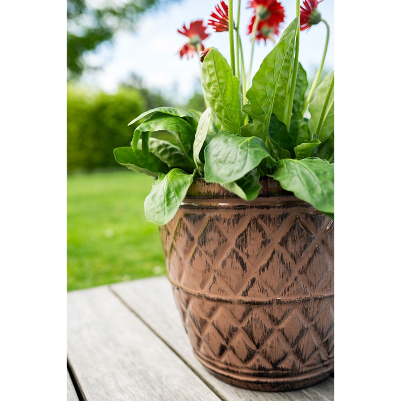 Ontdek de prachtige Caisa bloempot van TS Collection, speciaal ontworpen voor gebruik buitenshuis. Deze bloempot is gemaakt van metaal en is verkrijgbaar in 6 verschillende maten, waardoor er voor elke plant een passende optie is. Met de hand vervaardigd, heeft de Caisa bloempot het uiterlijk van keramiek, maar is hij lichtgewicht en gemakkelijk verplaatsbaar. Dankzij de vorstbestendige eigenschappen en de waterbestendige coating aan de binnenzijde is de pot geschikt voor alle weersomstandigheden. Het drainagesysteem zorgt ervoor dat overtollig water gemakkelijk kan weglopen. De Caisa bloempot heeft levendige kleuren en een tijdloos en stijlvol ontwerp. Ze is afgewerkt met een hoogglans epoxylaag en een authentiek patroon.
